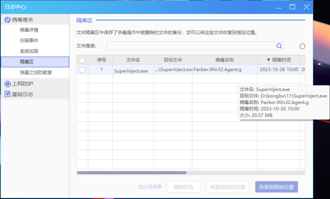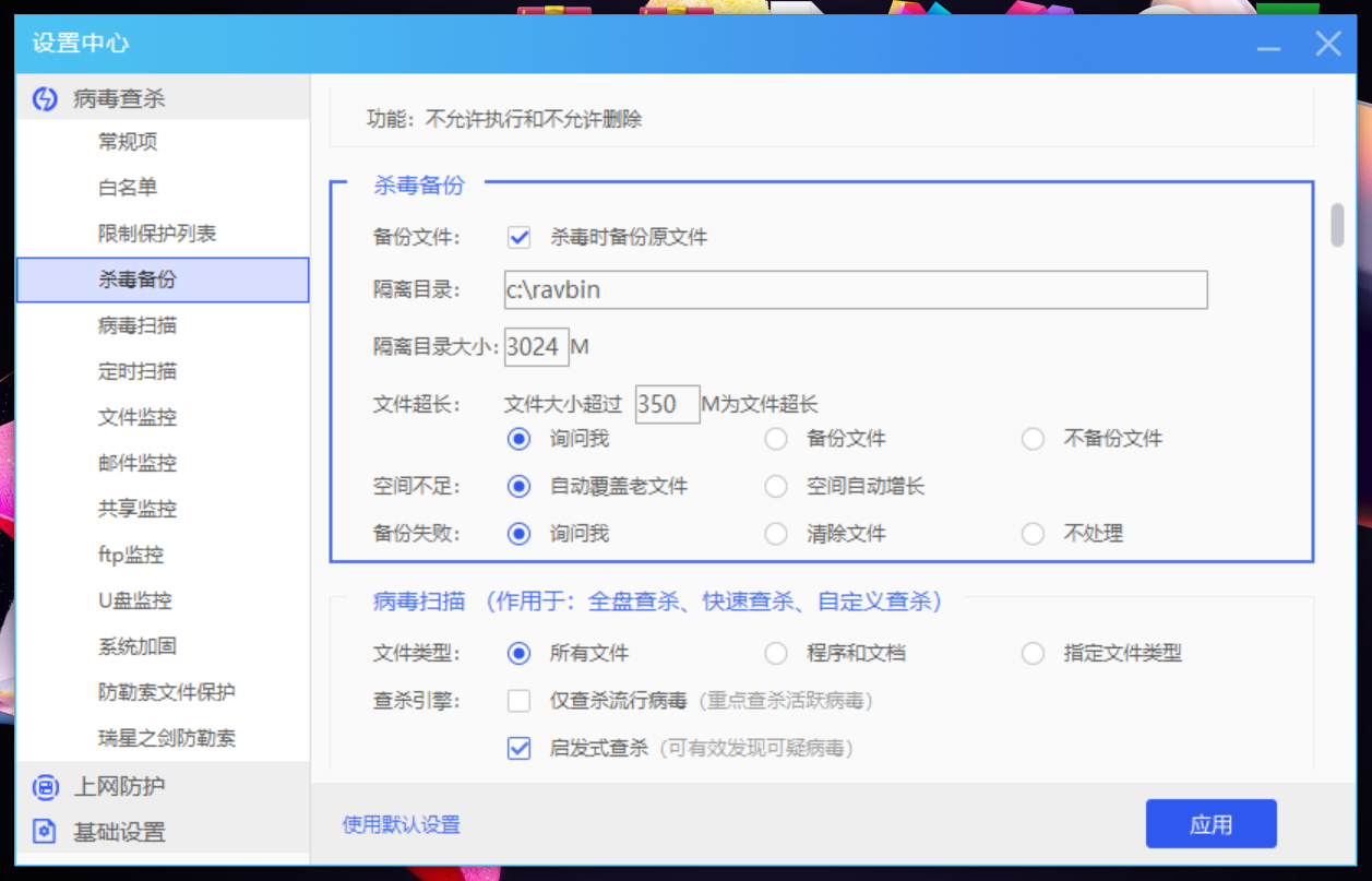结果: 发现托盘区显示瑞星备份空间不足,将隔离区设置为3G后,问题依旧