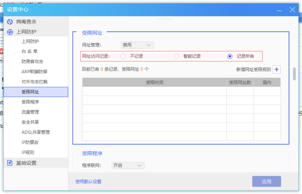 2.网址管理选择禁用,下面的访问记录选择记录所有,这种情况下日志中心依旧会记录访问的网址,功能既然都禁用了,怎么还能有部分功能还能用呢?如果逻辑是两个独立的,希望把这两个功能分开。