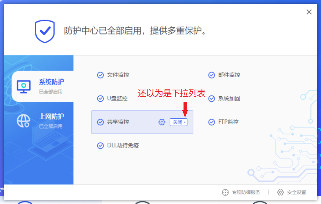 防护中心界面的开关居然有小箭头,不是下拉列表为啥要放箭头。