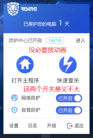托盘右键菜单和旧版基本一样,但其实这个菜单似乎安排得不太合理,真的有人通过这里开关防火墙和自我保护吗?如果右键菜单起不到便捷的作用,就没有意义。另外,主程序和快速查杀两个选项的动画也显得没必要,这动画需要将近1秒的时间,应该没人会把鼠标放上去1秒还不点击吧。不如做成鼠标放上去的时候图标周围发光,不需要动画。