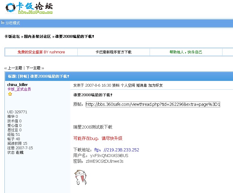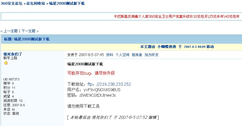 现在江民也在测试,不过他们的保密措施做的还不错,到现在也没见泄漏版本出来,主要也是他们只允许版主和金牌会员(类似社区嘉宾)参加吧。
