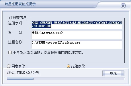 每次开机进入系统后,瑞星都提示注册表有改动要求我选择。请大狭们帮我看看是不是病毒啊。(对话框如下)小弟先谢了