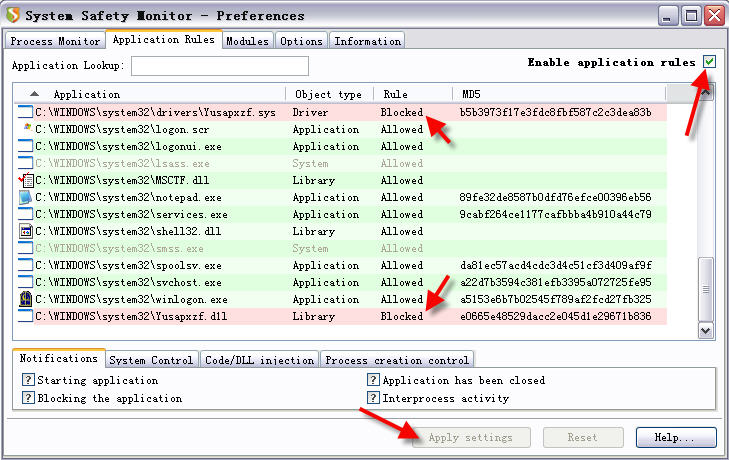 不过,即使在“应用程序规则”中输入正确的.sys和.d1l文件名,SSM还是不能阻止这个木马加载。