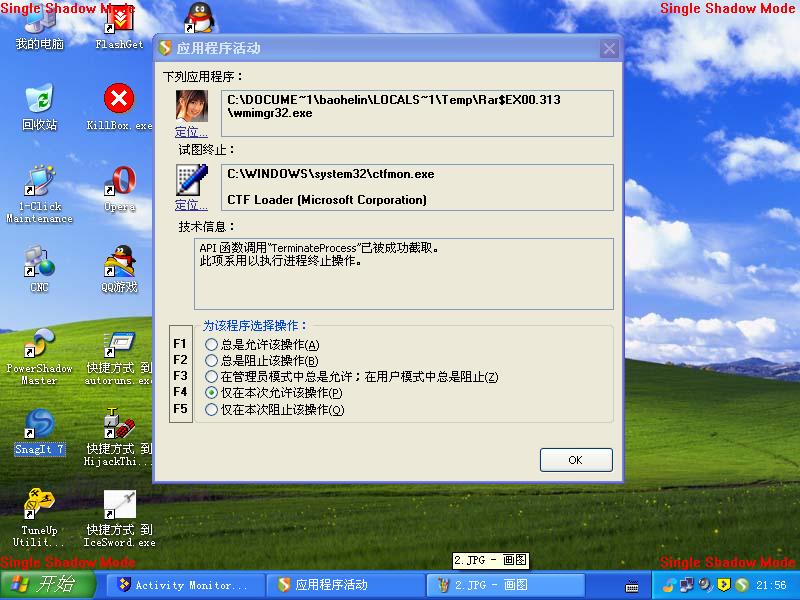 在powershadow的保护下,观察了一下这个蠕虫的感染过程。果然很变态。中招后,系统基本上就残废了。有系统光盘的,杀毒后,就用光盘修复系统吧。没系统光盘的,有系统GHOST备份也行。