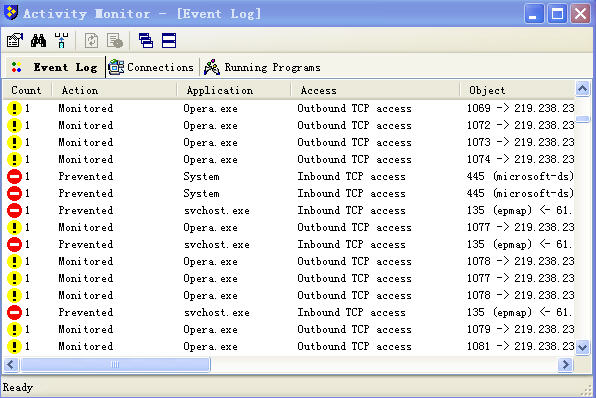 Tiny Personal Firewall 2005 Pro可以满足你的要求。进来的、出去的、拦截的、放行的——都可以显示得一清二楚。