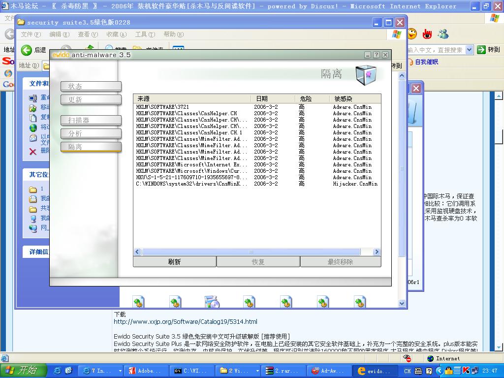 用ewido anti-malware软件查杀病毒,提示有Adware.CnsMin,Hijacker.CnsMin和TrackingCookie.Doubleclick三个感染目标(如图),不知道这是不是3个病毒,如果是该怎么删掉?