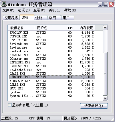 SERVICES.EXE  SYSTEM            cpu使用00          3468K