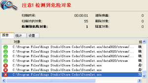 偶是从暴风影音的官方网站下载的,前天晚上升级的 卡巴斯基 5.388 专业版,昨天刚开机,卡巴就报 暴风影音安装目录下的 StormSet.exe 是病毒,要求删除,扫描暴风影音的安装文件,也报里面有病毒,大大家你们的杀毒软件报警了吗