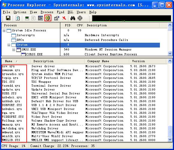 )一文,感觉到自己使用Procexp还是不到位。Procexp还有查看当前操作系统加载了那些驱动的功能,此功能对Rookit级木马的检测方面很有帮助。
