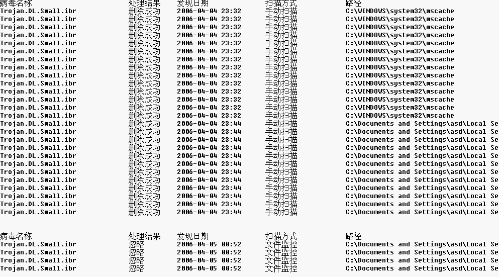 Trojan.DL.Small.ibr            忽略        2006-04-05 00:52      文件监控            C:\Documents and Settings\asd\Local Settings\Temporary Internet Files\LGCDPH4L\58                                      cf.scr.tmp