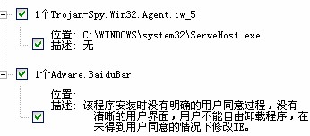 我电脑不知道为什么打开一个网页跟随着另个不相关的网页自动跑出来了。。我用了上网助手查了下。。得出的结果是Trojan-Spy.Win32.Agent.iw_5两次重复在windows\system32\servehost.exe的位置上另外还有个Adware.BaiduBar病毒。。这些恶意代码怎么删都删不掉。。请问下那位朋友能教下我怎么办呢?有没有相应杀毒工具可以解决呢》?谢谢了[img][/img]