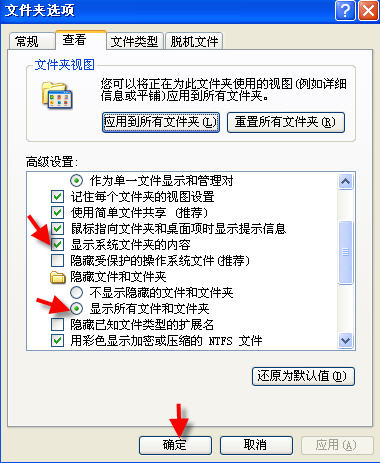 同时把“隐藏受保护的操作系统文件(推荐)”前的勾去掉