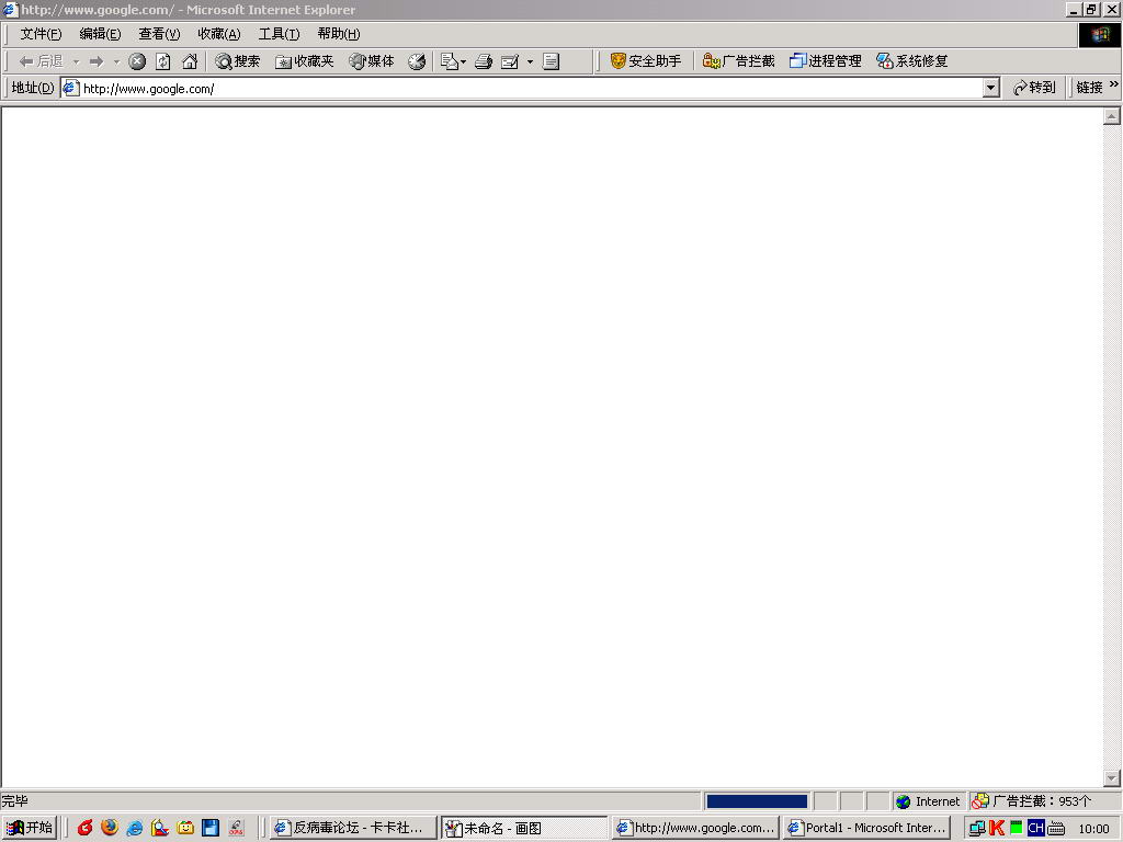 昨天开始就一直出现这种情况,我用IE打开google.com页面时就会出现附图那样的状况,正常的google页打不开,而总有一个广告窗口portal1一闪一闪的,把CPU使用率都占满了。查了一下历史记录,那个广告窗口页面的地址为 http://219.133.33.46/adportal/portal1.aspx?param=ABcHJvdmluY2VpZD0xMyZjaXR5aWQ9MTAmY2xhc3NpZD0xMTI4JnVzZXJuYW1lPXN6aGVua2FAMTYzLmdkJnNvdXJjZXVybD13d3cuZ29vZ2xlLmNvbS8=    。