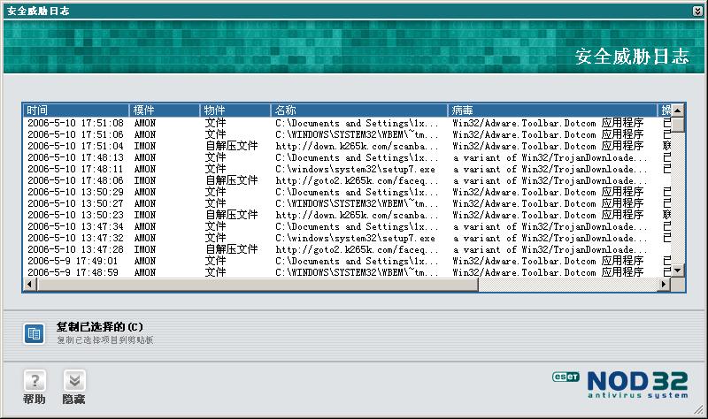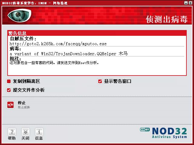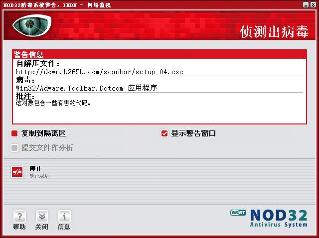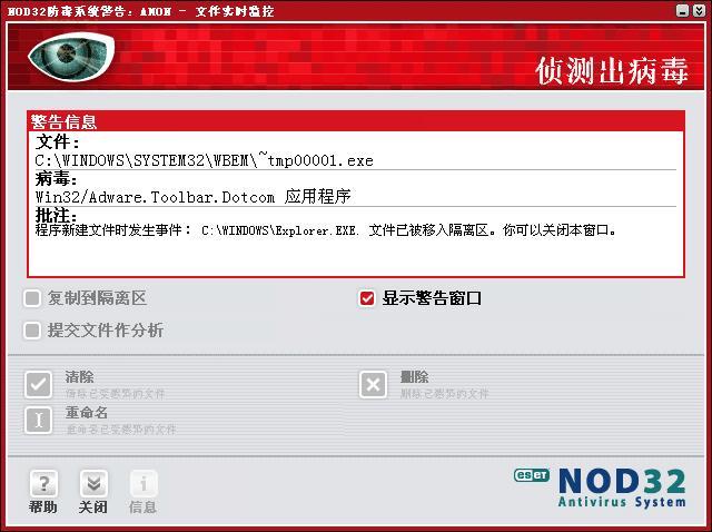 病毒是一定中了,用NOD32老是弹出以下的窗口