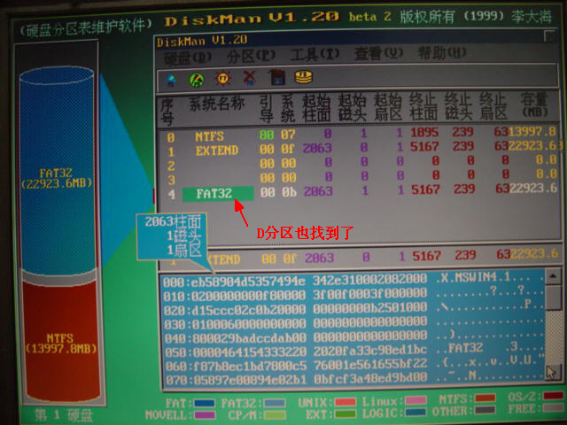 再往下找,又找到一个DPT(图2),从内容看,是原来的C分区。接着找,在2063柱面,1磁头,1扇区找到了D盘(图3)。