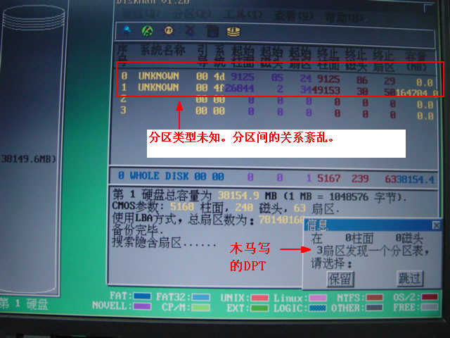 “自动重建”,速度快,但有其局限性。这种重建方式只搜索“隐含扇区”。结果只搜到两个结果,一个是木马写入的,一个是原来正确的。此时,如果点击“保留”,diskman将不再往下搜索。这样,只能找到C盘。然后,根据正确的接续关系,后移一个柱面,作为D盘的“起始柱面”,D盘的起始磁头与起始扇区均选择“1”。这样重建的DPT也能工作,但是,你进入系统后,点击D盘,系统会告诉你——D盘未格式化!(这时,千万不要格式化D盘。一格,D盘中原来的数据就完蛋了!)。