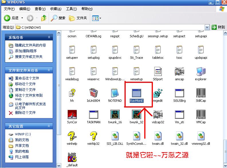 3.在C:\Windows\RavMonE.exe,结果掉它吧(最好在安全模式下)