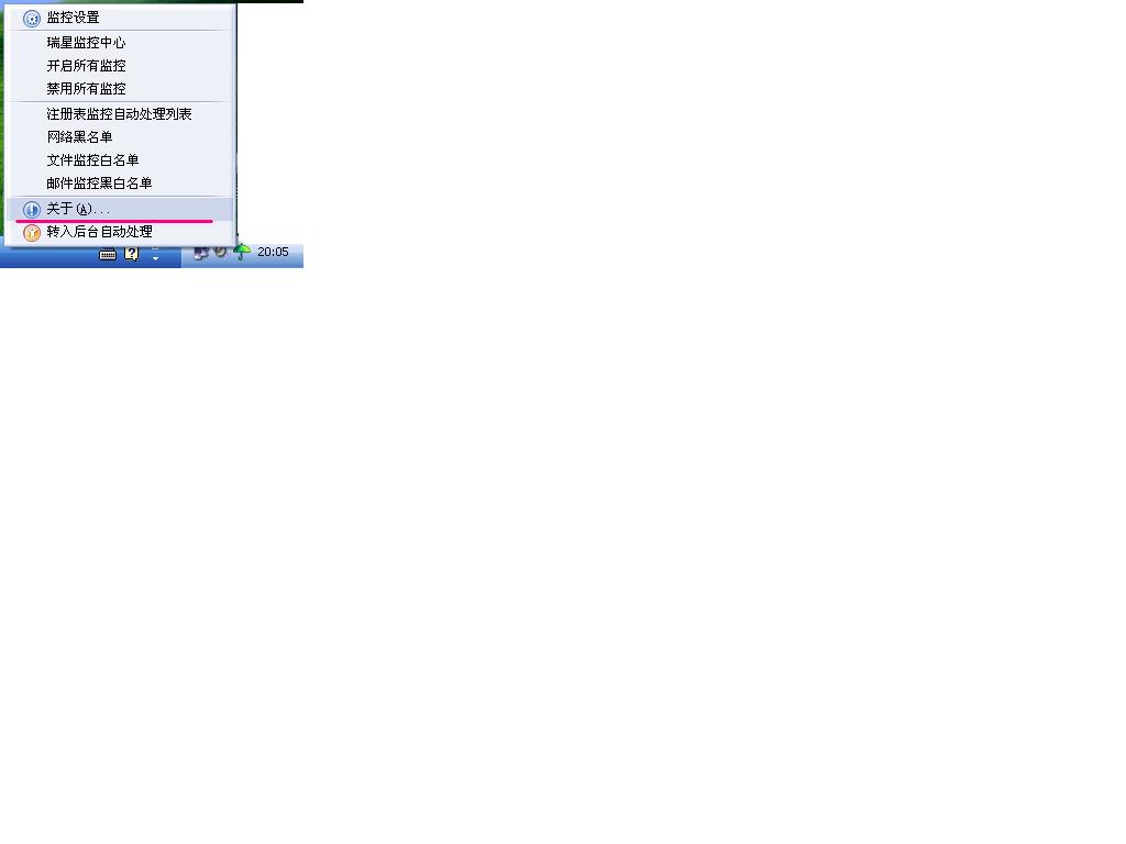 (1).大家如果都用过瑞星的话,应该会知道瑞星杀毒软件启动以后在任务栏处会有一把绿色的小伞,好了,第一个症状就是:当你对着这把小绿伞单击鼠标右键的时候,呵呵,看到变化了没?HOHO~对啦~以前那个“关于”菜单处被改成了“查杀病毒”。