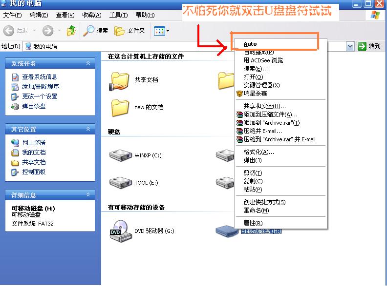 2.当我同学将U盘带回寝室后,在寝室电脑上使用U盘,当“我的电脑”上出现盘符标识后,很多同学习惯性的双击U盘想打开U盘,这个时候即开始感染病毒,因为此时的U盘默认操作为执行Autorun.inf中的代码,于是导致电脑中病毒。