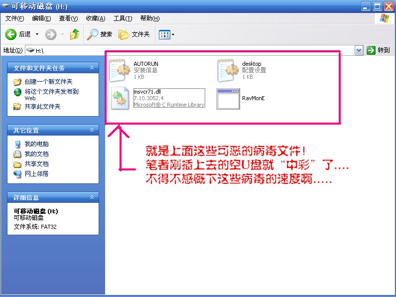 笔者是湖南衡阳市南华大学计算机学院045班的一个学生,使用的是正版瑞星杀毒软件2005,不过已经更新至2006最新版了,笔者学院里的专业机房一向是病毒的中转站,很多病毒通过这里再通过我们的U盘成功的感染我们个人的计算机。不过这些病毒一般使用正版的瑞星杀毒软件都能解决,所以一般也没有什么在意的,不过这些天很多同学都来找到我反映说U盘或电脑中病毒了,更夸张的是:杀毒软件居然也中病毒了,无法正常运行,更无法正常删除,根据笔者的观察,这个病毒一共有5个文件,分别是RavMonE.exe,Msvcr71.dll,Autorun.inf,RavMonlog,RavMonE.exe.log,现在我再详细的描述一下这个病毒的感染过程: