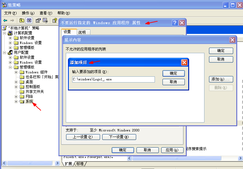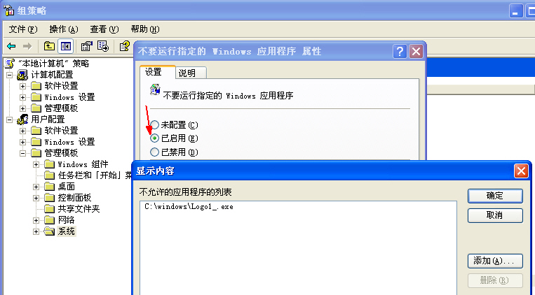运行 gpedit.msc 打开组策略 依次单击用户配置- 管理模块- 系统-指定不给windows运行的程序 点启用 然后 点显示 添加 logo1_exe