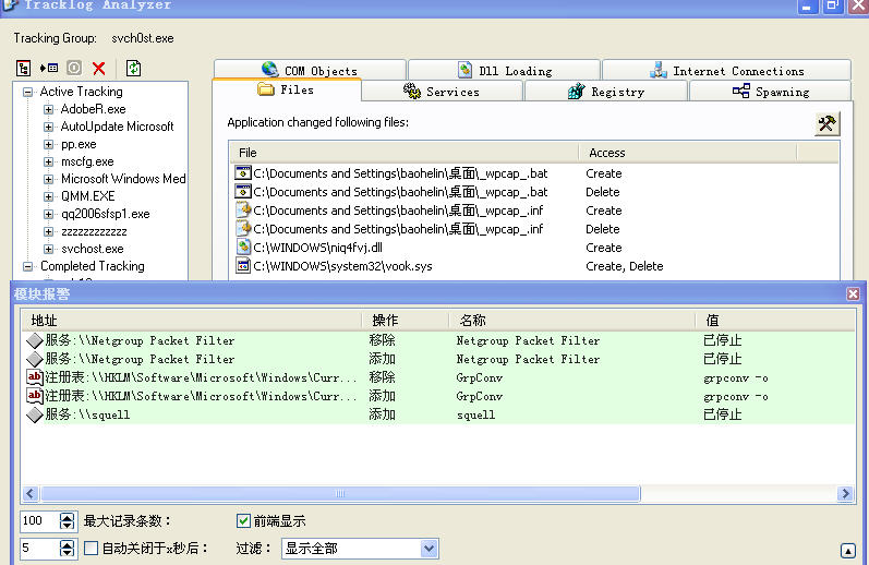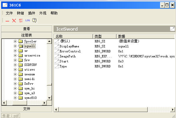 3、先在C:\windows\system32\下释放驱动vook.sys,待niq4fvl.dll释放到C:\windows\下且插入所有当前进程后,vook.sys便自裁了!重启系统后,原来添加到HKLM\System\CurrentControlSet\Services分支中的NPF也自裁了;但是,HKLM\System\CurrentControlSet\Services分支中的squell依然存在。(图3)