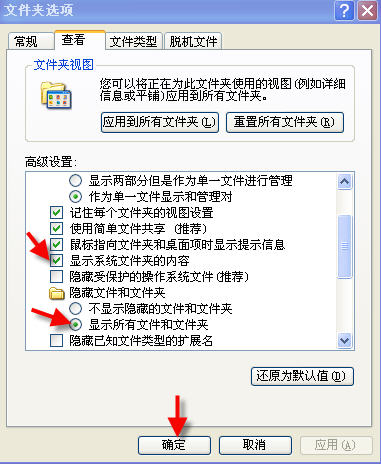 双击我的电脑,工具,文件夹选项,查看,单击选取"显示隐藏文件或文件夹"清除"隐藏受保护的操作系统文件(推荐)"复选框。在提示确定更改时,单击“是”,清除“隐藏已知文件类型的扩展名