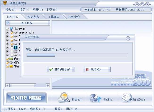 每次杀毒到一半一停止杀毒就出先警告还有15秒关机,但能取消!!