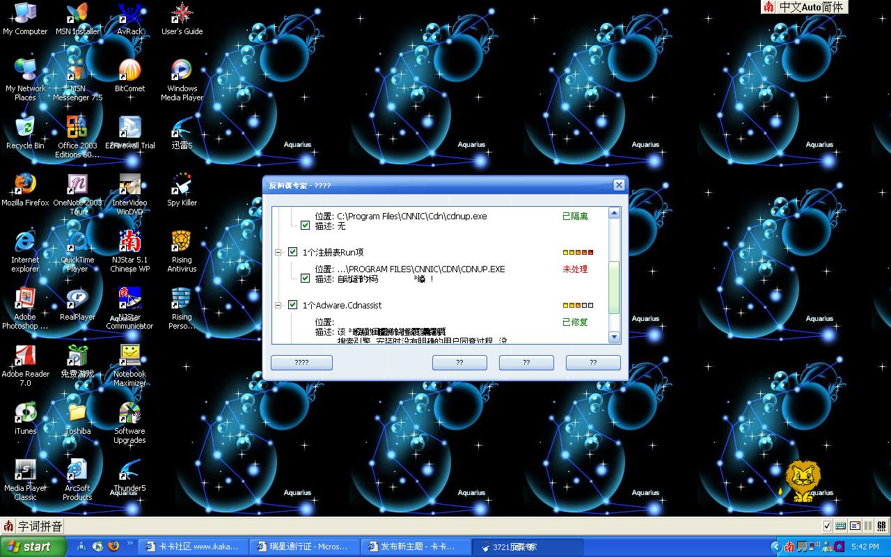 最近用电脑老是灰头土脸的,因为中了个什么CNNIC文件的病毒,搞得前一阵子不能上网。装了瑞星后好了不少,但是老是查不出最主要的病毒,就是杀不干净。。用3721反间谍专家可以查出那个病毒,但是没有能力删除。。。用瑞星更离谱,根本查不到那个病毒。。。