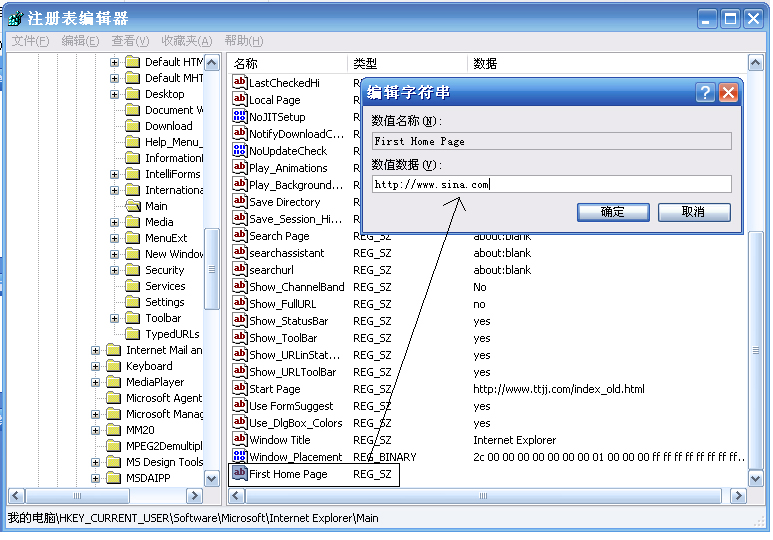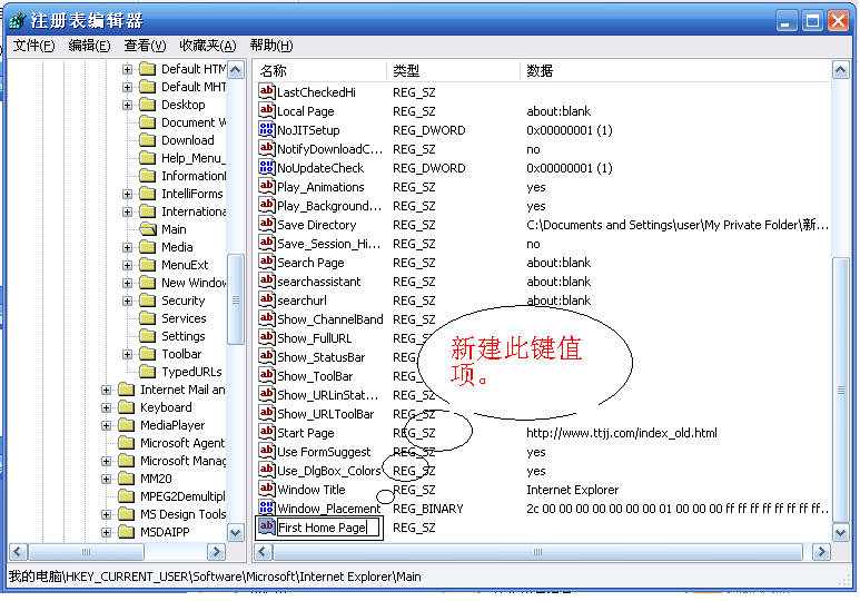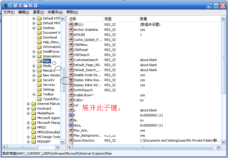 ,进入注册表编辑器,在左侧窗口依次展开[HKEY_CURRENT_USER\Software\Microsoft\Internet Explorer\Main]子键.