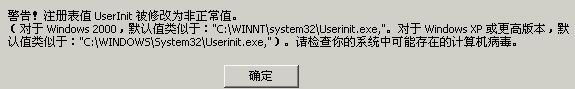 在System Repair Engineer的启动英目中发现警告,注册表值UserInit被修改为非正常值.(对于Windows 2000,默认值类似于:"C:\WINDOWS\System32\Userinit.exe,').请检档你的系统中可能存在的计算机病毒.