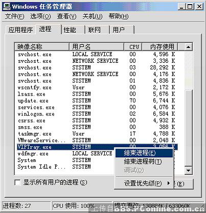 在任务管理器中找到名为"VIPTray.exe"的进程,单击鼠标右键,选择"结束进程"。