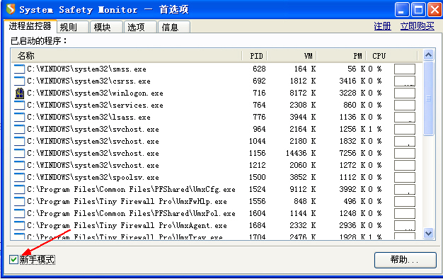 系统搞干净后,点击“新手模式”,即可将系统及正在运行的正常应用程序全部录入规则中。以后再次运行这些程序,SSM不会有任何提示。