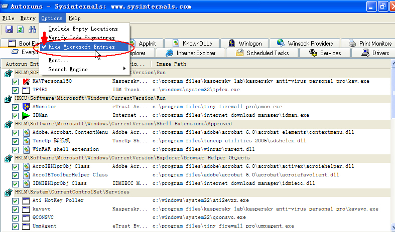 隐去微软的项目,autoruns日志内容会大大缩减。建议新手扫autoruns日志前,先按下图设置一下autoruns,去掉日志中所有微软的项目。然后,再扫日志贴上来。