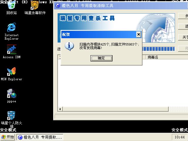 我和你的情况一样~橙色八月清除工具查杀不出东西来!而且所有关于瑞性的安装程序都无法启动.(除了光盘)光盘安装后也无法运行,1秒就关!