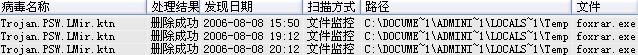 该病毒开机后每小时发作一次,在C:\Documents and Settings\Administrator\Local Settings\Temp生成foxrar.exe文件,同时生成以WIN打头的文件。