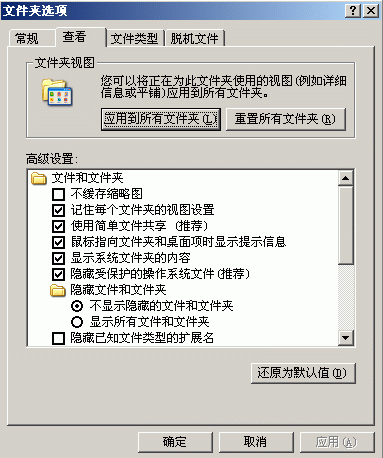 不能看隐藏文件夹了。上面那个复选的勾勾可以去掉,但下面的显示所有文件和文件夹那个选中后可以应用,但确定后再打开这个界面,就发现前面的小黑点还是在上面的不显示所有文件和文件夹那里。