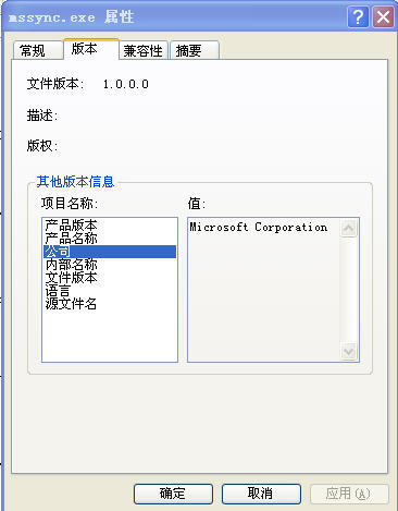 其中C:\WINDOWS\system32\mssync.exe的版本信息假冒微软程序(但冒充的不太像;图1)。