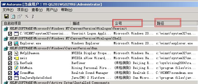 下了Autoruns7.01汉化版扫瞄了一下,第一次用这个软件,觉得挺好用的,上面有启动项的公司和路径,我首先对于公司项中含有(未检测)字样的项比较注意,然后就看路径,觉得如果是自己知道的安装路径下的文件,比较有把握的就不去管它,然后就是比较陌生的了,把文件名在baidu或google上搜一下,看看有没有相关的信息。