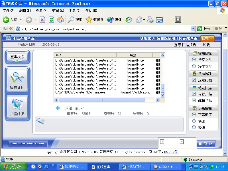 本人在前几天中了“落雪”,当时没想到上论坛来找专杀软件,笨人只好用笨方法,把C盘格掉了,但D盘没有动,然后重装XP、2006正版瑞星。但之后上网感觉还有病毒,于是在论坛上下载了“落雪”、“狮子落雪专杀”、江民的TrojanKiller.exe、杀灰鸽子的GPDetect.exe等软件,在安全模式下退通通杀一遍,全部杀干净了,但是上网查毒发现还有病毒,而且用江民的网上查毒和瑞星的网上查毒的结果不一样。结果如下图: