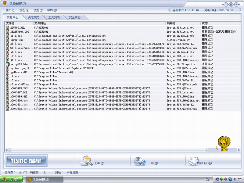 今天找人家借来正版瑞星,一杀,我倒