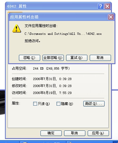 最近一直在查杀一个叫做Trojan.DL.Diyer.a的病毒,文件名是4042.exe>>tool.exe,文件目录是C:\Documents and Settings\All Users\Application Data\Microsoft\IEHelper,每次升级完病毒库杀瑞星都提示删除成功,但杀完了重杀还有,4042是个自解压形式的文件,双击会生成tool。exe,4042的属性是只读,我想改他的属性却提示“文件应用属性时出错,拒绝访问”在安全模式下也是这种状态,我都抓狂了,高手请给条出路啊 谢谢了