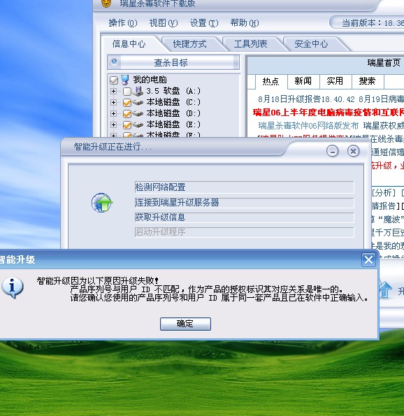 而在升级杀毒(18.36.11)的时候 ,,提示,,我的ID不正确, 请问这是怎么回事呢