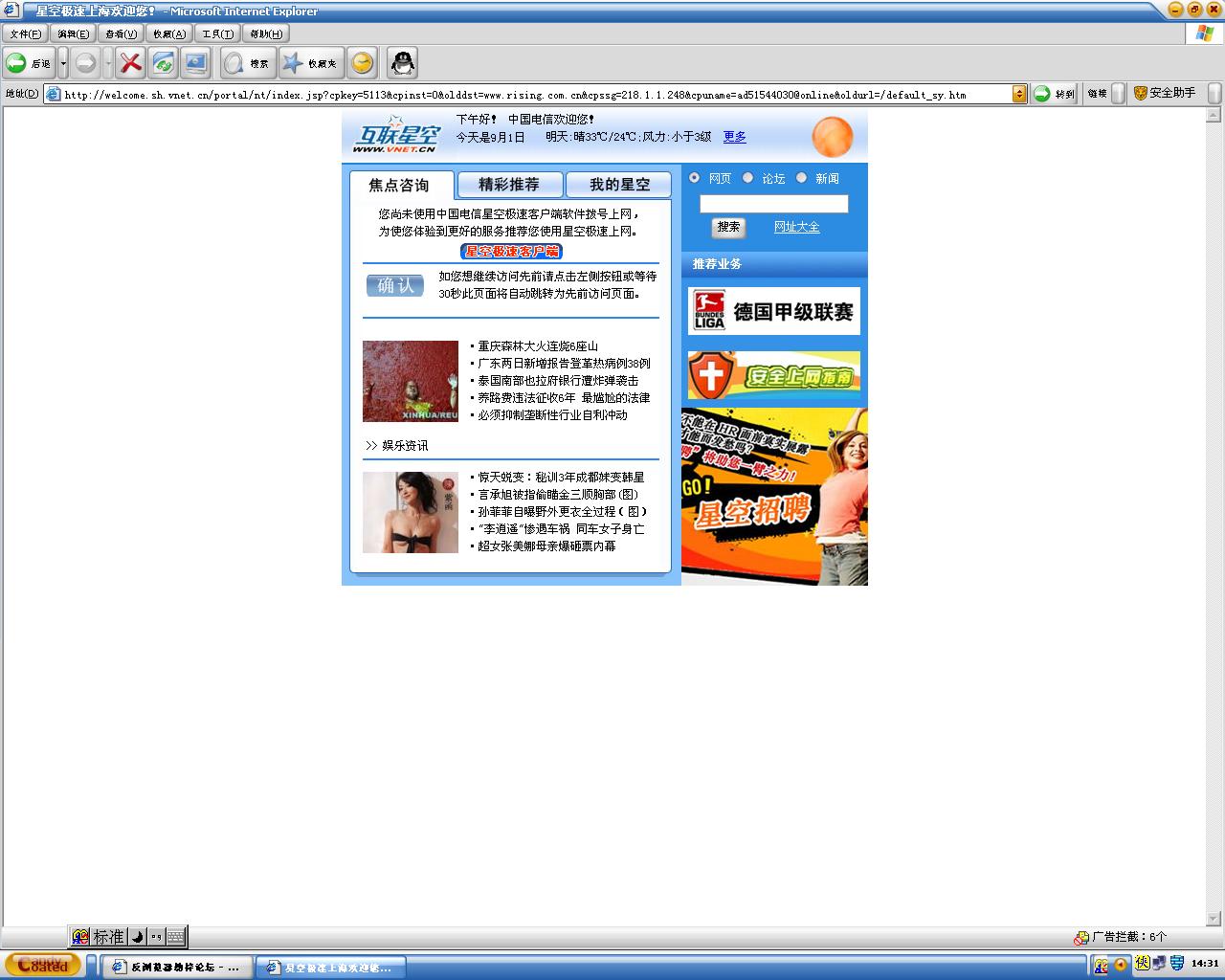 这两天不知怎么的,一上网就会弹出“中国电信星空极速上海欢迎您!”的页面,是要求你安装什么星空极速客户端的。用超级兔子,卡卡助手都无法恢复。