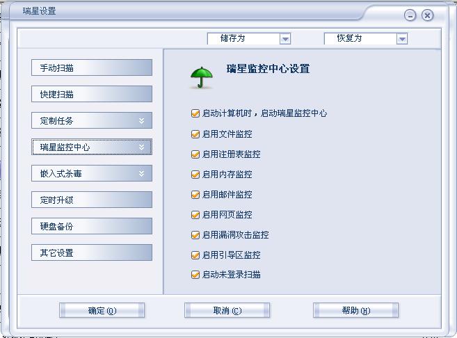 偶的电脑刚才被病毒攻击,我已把瑞星升级到最新版本,一共杀了27个病毒。但在电脑右下脚的监控中心(绿色小雨伞)却不见了,重启N次后也不恢复,请问我该怎么办呢??