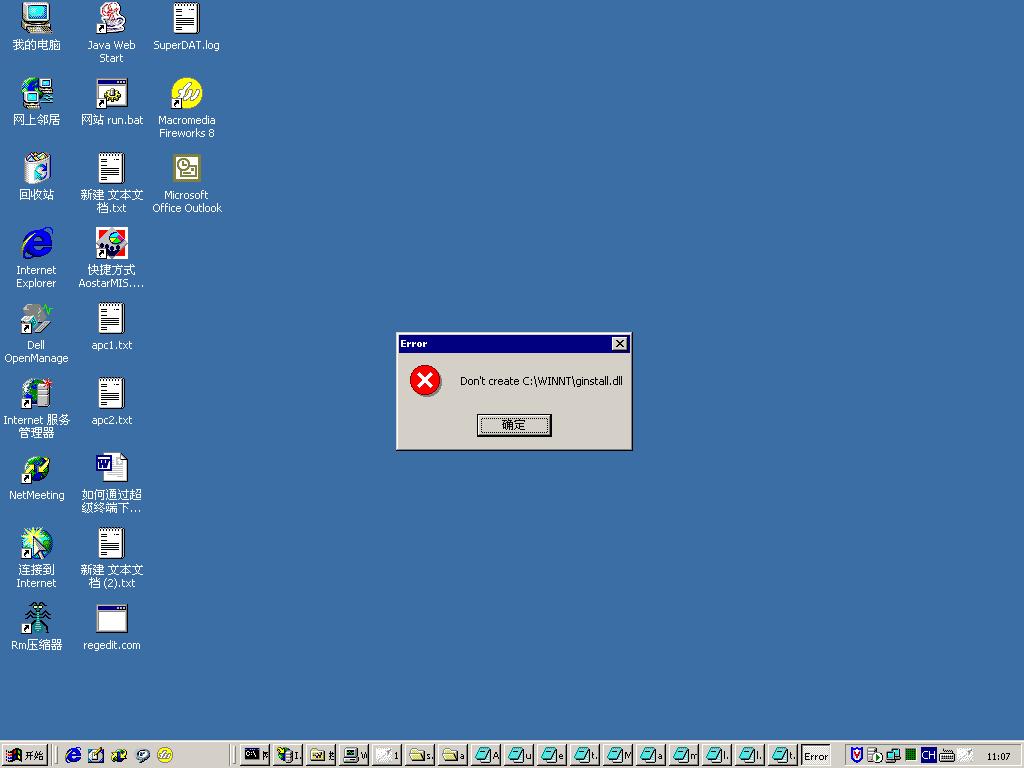 表象:一些文件(exe文件)图标被更改为acdsee50中文版(广捷居汉化)的大眼睛图标,点击该文件(如flashget)后,执行的不是flashget,而是acdsee50中文版的安装程序,用iceword察看到其在c:\windows\下创建ginstall.dll,如果用费尔手工将ginstall.dll删除并禁止创建,那么在点击该文件(如flashget)后,会报错,指明不能创建ginstall.dll,不能运行.如何解决这个问题呢?局域网有若干台机器上flashget/winrar/都出现这个问题,在网上查询没有结果!