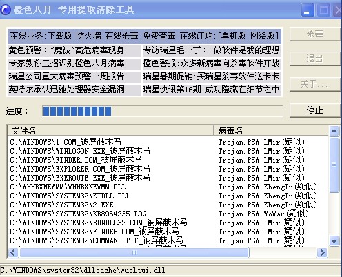 用ICEWORD1删除了windows\system32\drivers\nwupspx.sys文件,重启后瑞星监控图标就消失,木马杀客也打不开,说什么程序损坏,瑞星还可以用,接着在安全模式下用瑞星和橙色八月专杀,瑞星查不到一个病毒,而橙色则查到疑似病毒多种,但不能杀,图示:下,现在用Autoruns删除了windows\system32下的四.五个空文件及损坏文件,在安全模式下修复瑞星杀毒,现在瑞星监控基本运行正常!现在病症是:一段时间,就有网站弹出来,从刚开始中病毒时CPU100%,相比较好多了,CPU基本运行正常,只望解决下图疑似病毒!
