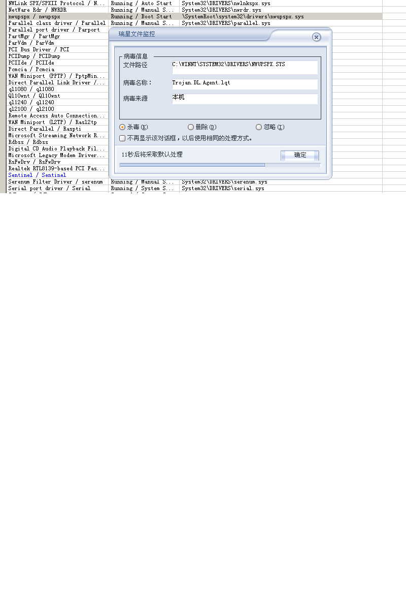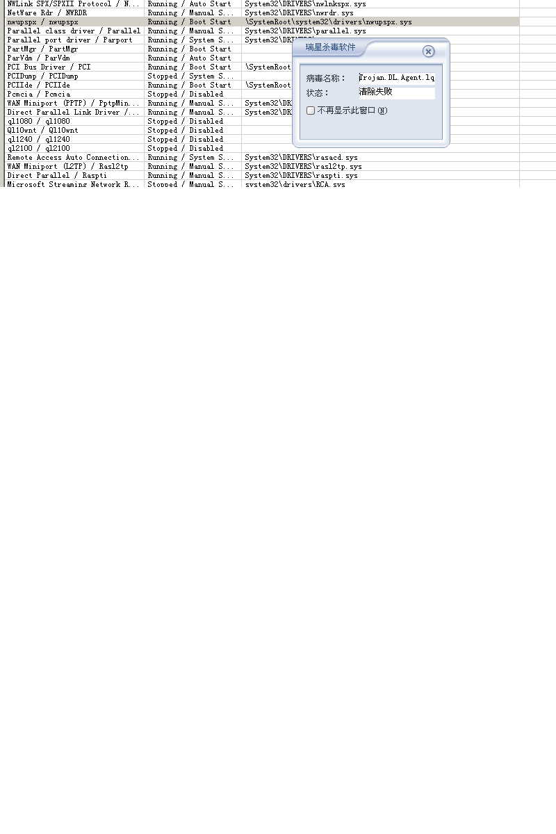 我一直没杀这个毒,因为冰刃1.18一安装,我的机子就重启。所以问题一直存在,开机后,杀毒,在%\System32\drivers下杀不掉nwupspx.sys(不知瑞星为什么杀不掉)。打开IE,瑞星监控报告拦截到Trojan.DL.Small.oan病毒的提示。我用SREng2扫描日志,发现SREng2的驱动服务项里面仍然有nwupspx存在,状态running,点击,居然不让动,出来nwupspx.sys,附图,删除失败。请问这病毒是什么病毒?攻击原理是什么?在没有冰刃的情况下怎么杀?