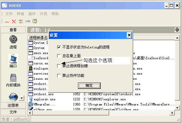 完后打开IceSword,点“文件”“设置”清除勾选“禁止进线程创建”,退出,