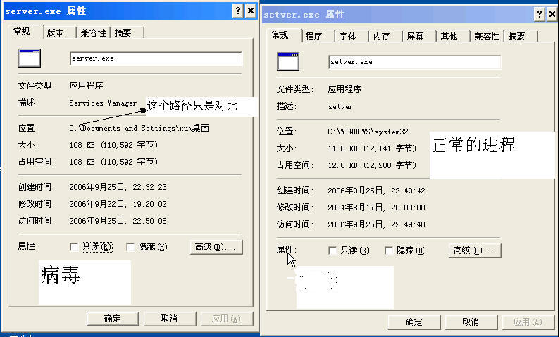 说明,C:\WINDOWS\system32\server.exe正常情况下是系统的东东,(具体比较看图)只所以说这个病毒诡异,其一是病毒运行后会替换正常的server.exe。用任务管理器可以终止它的进程,但立即会死灰复燃。